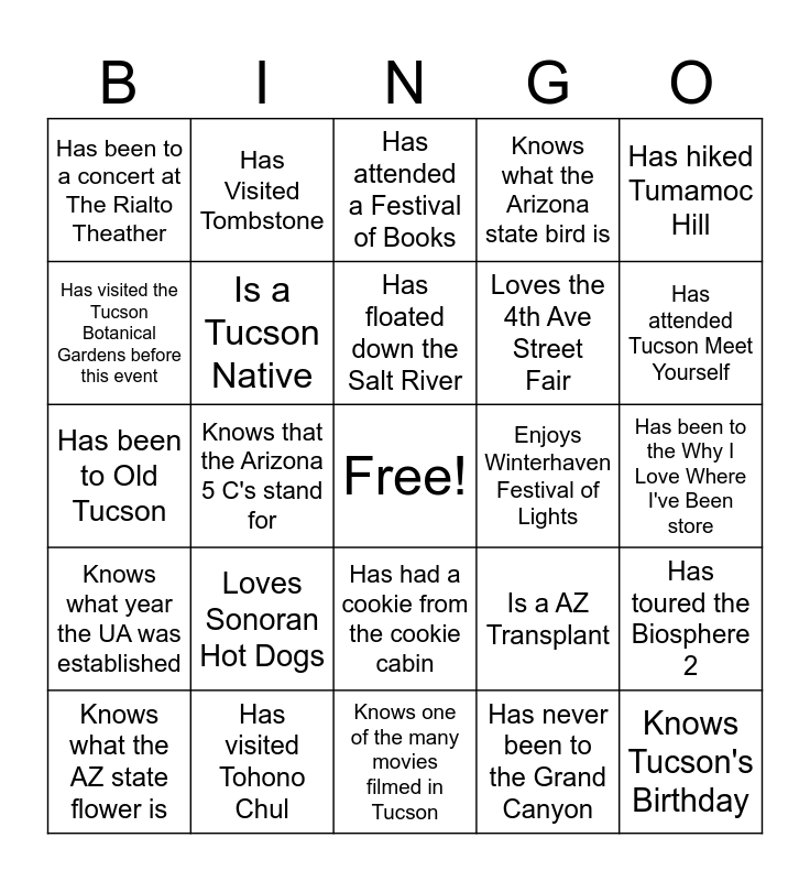 This bingo card has a free space and 24 words: Loves Sonoran Hot Dogs, Has visited Tohono Chul, Has floated down the Salt River, Knows what the AZ state flower is, Has hiked Tumamoc Hill, Has been to a concert at The Rialto Theather, Has visited the Tucson Botanical Gardens before this event, Has Visited Tombstone, Enjoys Winterhaven Festival of Lights, Has had a cookie from the cookie cabin, Loves the 4th Ave Street Fair, Has been to Old Tucson, Is a AZ Transplant, Has toured the Biosphere 2, Is a Tucson Native, Has never been to the Grand Canyon, Has been to the Why I Love Where I've Been store, Has attended a Festival of Books, Has attended Tucson Meet Yourself, Knows that the Arizona 5 C's stand for, Knows Tucson's Birthday, Knows what year the UA was established, Knows what the Arizona state bird is and Knows one of the many movies filmed in Tucson.