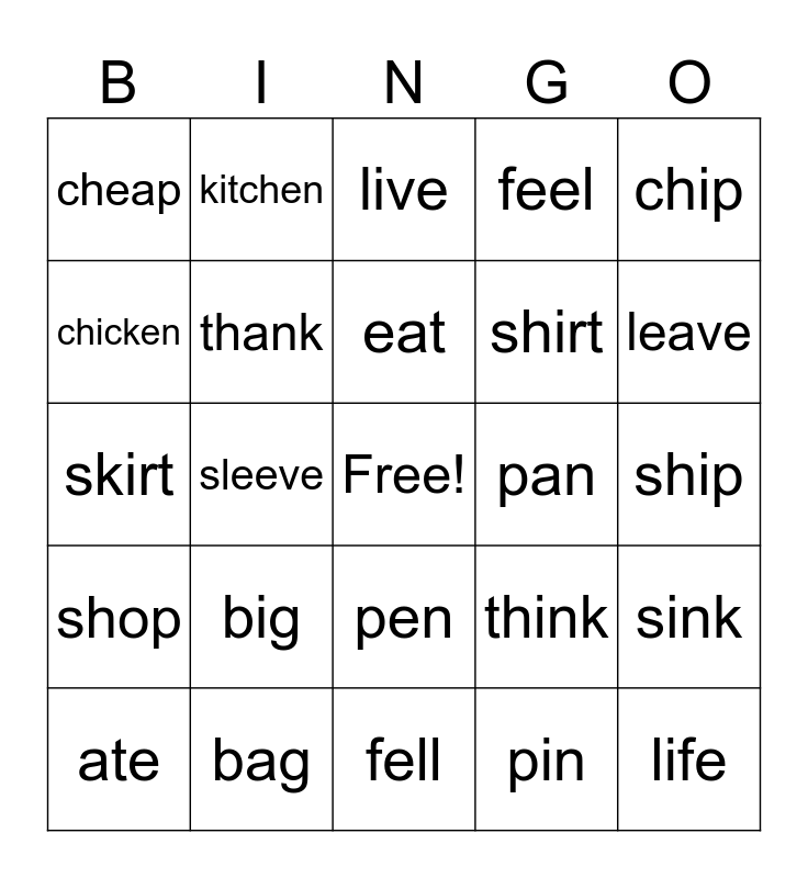 This bingo card has a free space and 24 words: big, bag, eat, ate, chip, cheap, chicken, kitchen, pan, pen, shirt, skirt, think, sink, thank, pin, ship, live, leave, sleeve, life, shop, feel and fell.