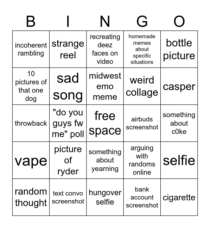 This bingo card has a free space and 24 words: picture of ryder, text convo screenshot, midwest emo meme, random thought, bottle picture, incoherent rambling, 10 pictures of that one dog, strange reel, airbuds screenshot, something about yearning, weird collage, throwback, arguing with randoms online, selfie, sad song, bank account screenshot, something about c0ke, recreating deez faces on video, casper, "do you guys fw me" poll, cigarette, vape, homemade memes about specific situations and hungover selfie.