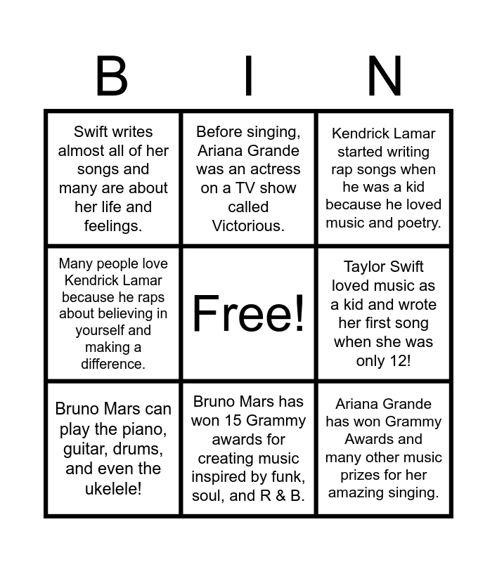 This bingo card has a free space and 8 words: Taylor Swift loved music as a kid and wrote her first song when she was only 12!, Kendrick Lamar started writing rap songs when he was a kid because he loved music and poetry., Before singing, Ariana Grande was an actress on a TV show called Victorious., Bruno Mars can play the piano, guitar, drums, and even the ukelele!, Swift writes almost all of her songs and many are about her life and feelings., Ariana Grande has won Grammy Awards and many other music prizes for her amazing singing., Many people love Kendrick Lamar because he raps about believing in yourself and making a difference. and Bruno Mars has won 15 Grammy awards for creating music inspired by funk, soul, and R & B..