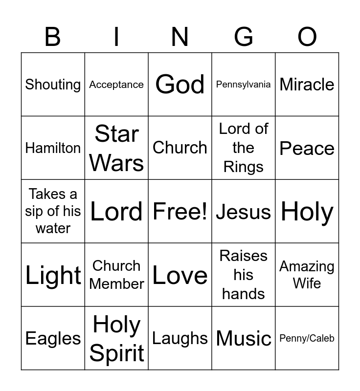 This bingo card has a free space and 29 words: Eagles, Pray, Lord, Amen, Shouting, God, Star Wars, Church Member, Jesus, Holy Spirit, Holy, Penny/Caleb, Laughs, Music, Peace, Good, Love, Light, Miracle, Takes a sip of his water, Raises his hands, Large Pause, Lord of the Rings, Hamilton, Pennsylvania, Acceptance, Amazing Wife, Church and Service to others.