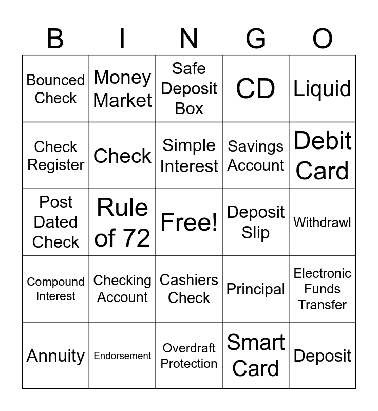 This bingo card has a free space and 25 words: Checking Account, Overdraft Protection, Simple Interest, Annuity, Liquid, Bounced Check, Check Register, Money Market, Deposit Slip, Cashiers Check, Savings Account, Post Dated Check, Principal, Electronic Funds Transfer, Check, Stop Payment, Withdrawl, Safe Deposit Box, Debit Card, Rule of 72, Deposit, Endorsement, Compound Interest, CD and Smart Card.