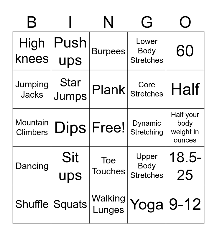 This bingo card has a free space and 24 words: Shuffle, Sit ups, Plank, Yoga, 60, High knees, Push ups, Burpees, Dynamic Stretching, Half your body weight in ounces, Mountain Climbers, Star Jumps, Upper Body Stretches, 18.5-25, Jumping Jacks, Squats, Walking Lunges, Lower Body Stretches, Half, Dancing, Dips, Toe Touches, Core Stretches and 9-12.
