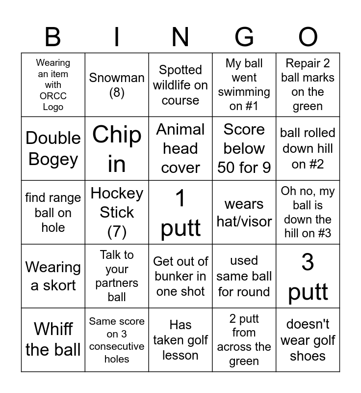 This bingo card has 65 words: Bogey, That's a bad word!, One putt, 3 putt, Land in a bunker, Par a par 3, Snowman (8), Birdie or net Birdie, Animal head cover, Pink ball in your bag, Get out of bunker in one shot, Birdie Juice in your bag, Oh no, my ball is down the hill on #3, Repair 2 ball marks on the green, Talk to your ball, Double Bogey, Hockey Stick (7), Wearing an item with ORCC Logo, Closest to the pin for your group on a Par 3, Score below 50 for 9, Talk to your partners ball, Wearing a skort, My ball went swimming on #1, Par or net par a par 4, Triple Bogey, Lose a Ball, 2 putt, Par or net par a a par 5, 1 putt, Find a ball that is not yours, Whiff the ball, worm burner, duffed shot, stayed for lunch, used same ball for round, Same score on 3 consecutive holes, Max out of hole, find range ball on hole, 2 putt from across the green, holed ball from fringe, Chip in, wears glove, wears hat/visor, wears sunglasses, has golf jewelry, hit from down hill lie, ball rolled down hill on #2, hit from uphill lie, doesn't wear golf shoes, Fairway all day!, Lip out putt, Ball hit a tree, Hit cart path, Has taken golf lesson, Watches golf on TV, practices at home, has a golf collection (tees, markers, pencils...), Spotted wildlife on course, played golf in another state, Round with no penalties, best round of your life, Sandy par/net par, closest to hole in your group (Par 3), Most putts on hole in group and hit flag.