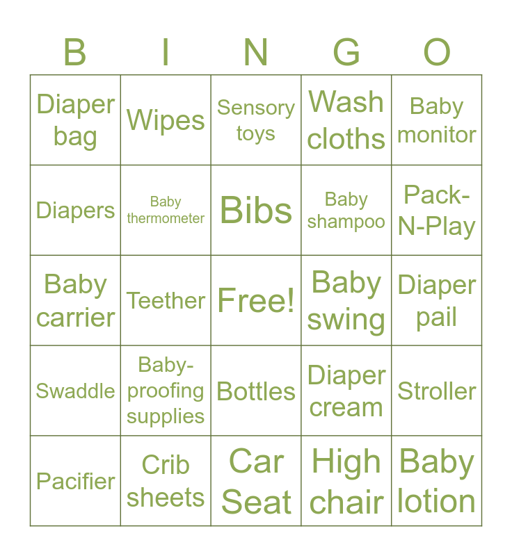 This bingo card has a free space and 26 words: Bottles, High chair, Bibs, Crib sheets, Baby monitor, Diaper bag, Diapers, Wipes, Diaper pail, Diaper cream, Baby shampoo, Baby carrier, Stroller, Pacifier, Teether, Bath toys, Wash cloths, Swaddle, Sensory toys, Baby lotion, Pack-N-Play, Car Seat, Baby swing, Baby-proofing supplies, Baby thermometer and Changing pad.