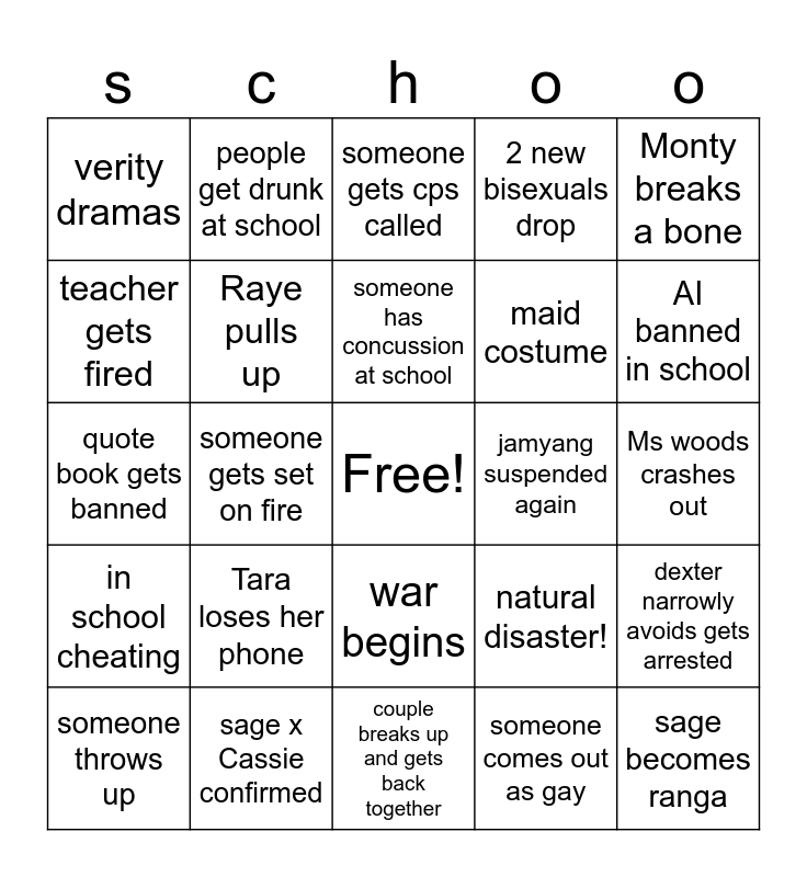 This bingo card has a free space and 24 words: Tara loses her phone, sage x Cassie confirmed, someone has concussion at school, someone throws up, Monty breaks a bone, verity dramas, teacher gets fired, people get drunk at school, jamyang suspended again, war begins, maid costume, quote book gets banned, natural disaster!, dexter narrowly avoids gets arrested, Raye pulls up, someone comes out as gay, Ms woods crashes out, someone gets cps called, AI banned in school, someone gets set on fire, sage becomes ranga, in school cheating, 2 new bisexuals drop and couple breaks up and gets back together.