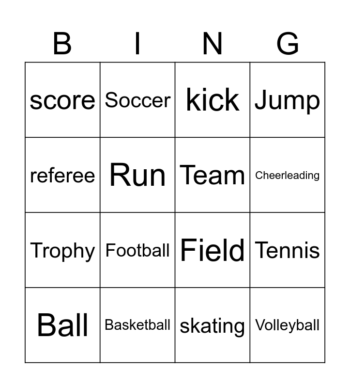 This bingo card has 16 words: Basketball, Tennis, kick, score, Trophy, Soccer, Field, skating, referee, Run, Ball, Jump, Football, Cheerleading, Team and Volleyball.