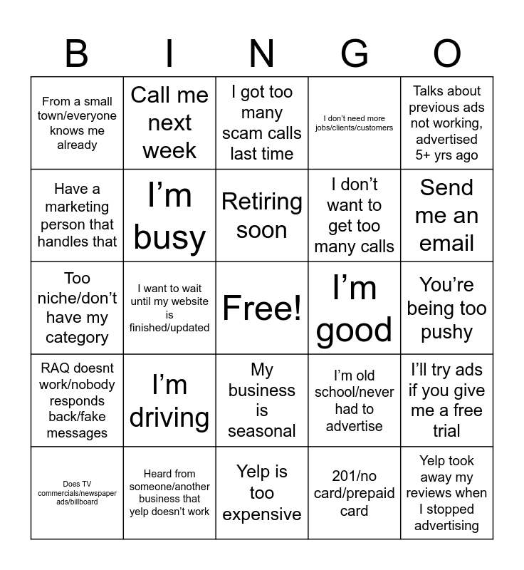 This bingo card has a free space and 26 words: My business is seasonal, 201/no card/prepaid card, Retiring soon, Heard from someone/another business that yelp doesn’t work, Talks about previous ads not working, advertised 5+ yrs ago, From a small town/everyone knows me already, Have a marketing person that handles that, Call me next week, You’re being too pushy, I’m old school/never had to advertise, I don’t want to get too many calls, Too niche/don’t have my category, I’ll try ads if you give me a free trial, Does TV commercials/newspaper ads/billboard, I want to wait until my website is finished/updated, Yelp scammed me, I don’t need more jobs/clients/customers, RAQ doesnt work/nobody responds back/fake messages, I got too many scam calls last time, Yelp took away my reviews when I stopped advertising, Send me an email, Yelp is too expensive, I’m good, I’m driving, I’m busy and I’m just the NDM.