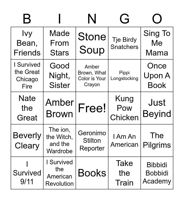 This bingo card has a free space and 24 words: The ion, the Witch, and the Wardrobe, I Survived the American Revolution, Amber Brown, What Color is Your Crayon, I Survived 9/11, Sing To Me Mama, Ivy Bean, Friends, I Survived the Great Chicago Fire, Made From Stars, Kung Pow Chicken, Geronimo Stilton Reporter, Pippi Longstocking, Nate the Great, I Am An American, The Pilgrims, Good Night, Sister, Take the Train, Just Beyind, Stone Soup, Once Upon A Book, Amber Brown, Bibbidi Bobbidi Academy, Beverly Cleary, Tje Birdy Snatchers and Books.
