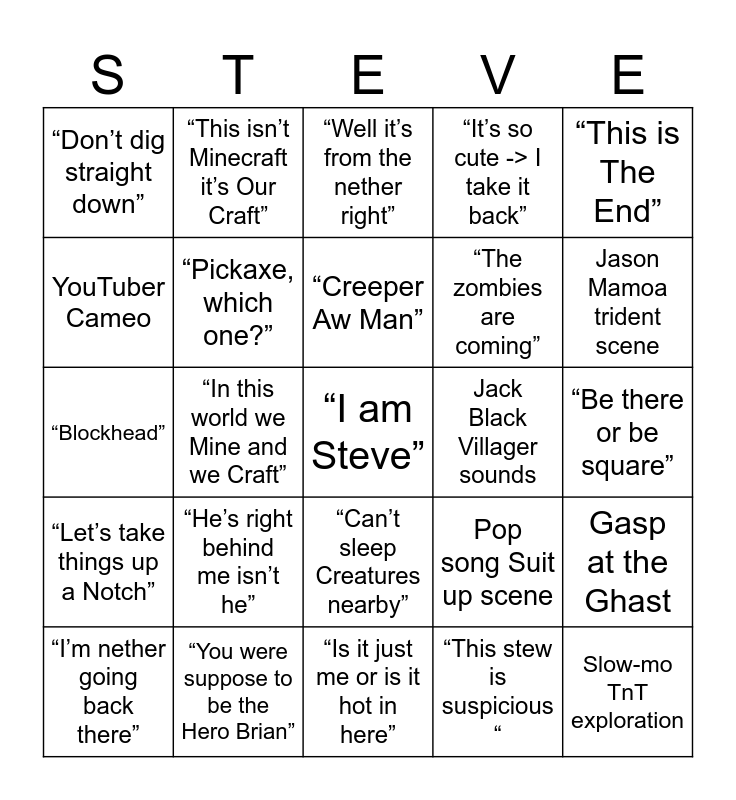 This bingo card has a free space and 24 words: “He’s right behind me isn’t he”, “You were suppose to be the Hero Brian”, “Creeper Aw Man”, “I’m nether going back there”, “This is The End”, “Don’t dig straight down”, YouTuber Cameo, “This isn’t Minecraft it’s Our Craft”, Jack Black Villager sounds, “Can’t sleep Creatures nearby”, “The zombies are coming”, “Blockhead”, Pop song Suit up scene, Gasp at the Ghast, “Pickaxe, which one?”, “This stew is suspicious “, “Be there or be square”, “Well it’s from the nether right”, Jason Mamoa trident scene, “In this world we Mine and we Craft”, Slow-mo TnT exploration, “Let’s take things up a Notch”, “It’s so cute -> I take it back” and “Is it just me or is it hot in here”.