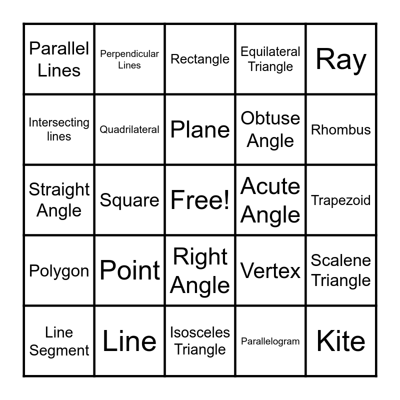 This bingo card has a free space and 24 words: Point, Line, Plane, Line Segment, Ray, Parallel Lines, Intersecting lines, Perpendicular Lines, Acute Angle, Right Angle, Obtuse Angle, Straight Angle, Vertex, Scalene Triangle, Quadrilateral, Parallelogram, Trapezoid, Rectangle, Rhombus, Square, Kite, Polygon, Equilateral Triangle and Isosceles Triangle.