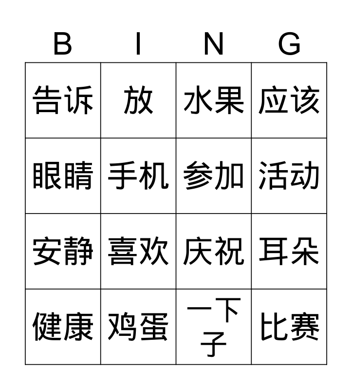 This bingo card has 16 words: 鸡蛋, 耳朵, 水果, 告诉, 安静, 放, 庆祝, 一下子, 眼睛, 手机, 健康, 应该, 喜欢, 活动, 参加 and 比赛.