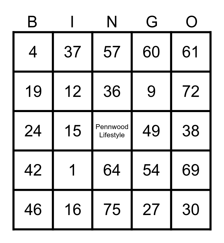 This bingo card has a free space and 24 words: 1, 16, 36, 46, 61, 4, 19, 37, 49, 64, 9, 24, 54, 69, 12, 27, 38, 57, 72, 15, 30, 42, 60 and 75.