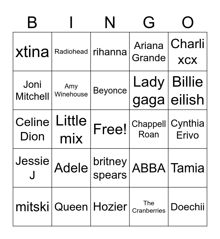 This bingo card has a free space and 24 words: Adele, Queen, Beyonce, mitski, Charli xcx, xtina, Joni Mitchell, Radiohead, Chappell Roan, britney spears, Lady gaga, Celine Dion, ABBA, Tamia, Amy Winehouse, The Cranberries, Cynthia Erivo, rihanna, Billie eilish, Little mix, Doechii, Jessie J, Ariana Grande and Hozier.