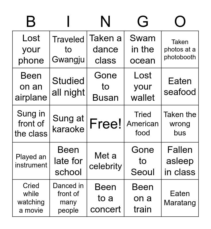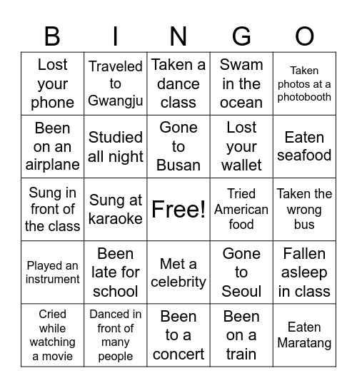 This bingo card has a free space and 28 words: Fallen asleep in class, Traveled with your friends, Lost your wallet, Been on a train, Been on an airplane, Taken a dance class, Traveled to Gwangju, Played an instrument, Tried American food, Cried while watching a movie, Sung in front of the class, Swam in the ocean, Danced in front of many people, Been to a concert, Eaten seafood, Gone to the movie theater, Been late for school, Studied all night, Gone to Busan, Met a celebrity, Lost your phone, Hiked up a mountain, Eaten Maratang, Sung at karaoke, Taken the wrong bus, Gone to Seoul, Taken photos at a photobooth and Studied a language other than English.