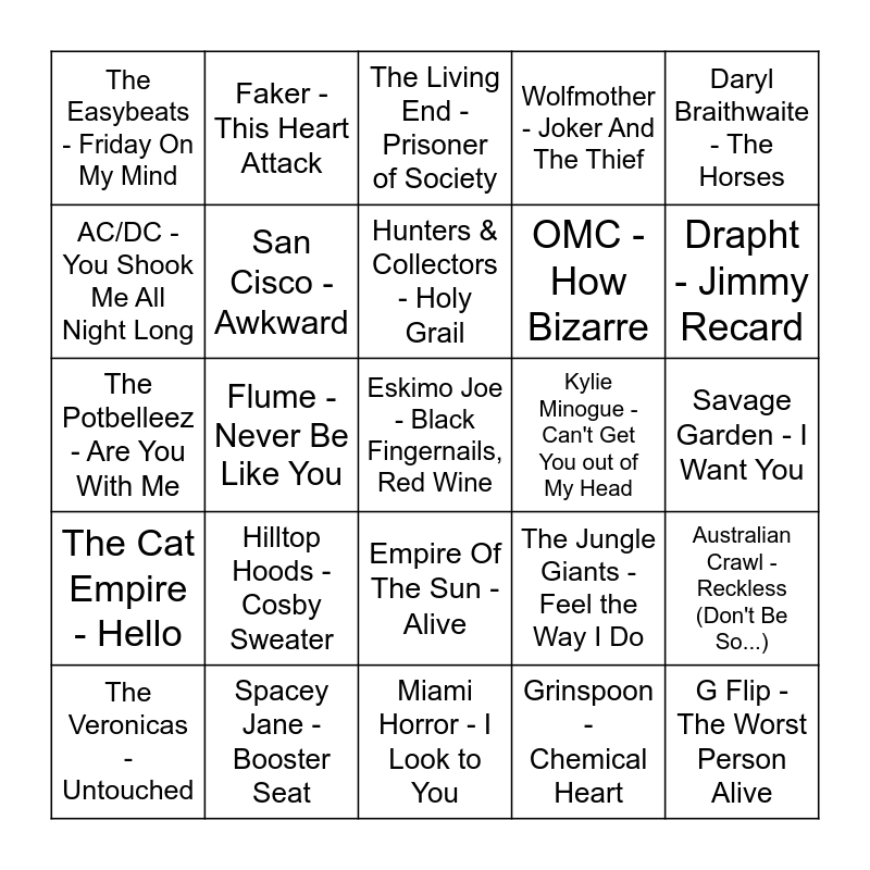 This bingo card has 60 words: Gang of Youths - Let Me Down Easy, Spacey Jane - Booster Seat, Alex Lloyd - Amazing, The Cat Empire - Hello, Grinspoon - Chemical Heart, Powderfinger - My Happiness, San Cisco - Awkward, The Rubens - Hoops, OMC - How Bizarre, Divinyls - I Touch Myself, Wolfmother - Joker And The Thief, Gotye - Somebody That I Used To Know, AC/DC - You Shook Me All Night Long, Paul Kelly - Dumb Things, Dave Dobbyn - Slice of Heaven, The Easybeats - Friday On My Mind, Eskimo Joe - Black Fingernails, Red Wine, Daryl Braithwaite - The Horses, Hoodoo Gurus - What's My Scene, Hunters & Collectors - Holy Grail, Kylie Minogue - Can't Get You out of My Head, The Living End - Prisoner of Society, The Veronicas - Untouched, Australian Crawl - Reckless (Don't Be So...), Dragon - Are You Old Enough, Madison Avenue - Don't Call Me Baby, FISHER - Losing It, Jimmy Barnes - Working Class Man, Drapht - Jimmy Recard, Sia - Chandelier, Vance Joy - Riptide, Thirsty Merc - In the Summertime, The Angels - Am I, The Avalanches - Frontier Psychiatrist, Faker - This Heart Attack, The Presets - My People, Art vs Science - Parlez Vous Francais, Flume - Never Be Like You, Bag Raiders - Shooting Stars, The Potbelleez - Are You With Me, Troye Sivan - Rush, Hilltop Hoods - Cosby Sweater, Savage Garden - I Want You, The Whitlams - Blow Up The Pokies, The Jungle Giants - Feel the Way I Do, Spiderbait - Black Betty, Killing Heidi - Mascara, Rogue Traders - Voodoo Child, Lorde - Royals, Empire Of The Sun - Alive, Miami Horror - I Look to You, GANGgajang - Sounds Of Then (This Is Australia), Sneaky Sound System - UFO, The Screaming Jets - Better, H2O: Just Add Water - No Ordinary Girl, Kisschasy - Do-Do's And Whoa-Oh's, The Androids - Do It with Madonna, Dune Rats - Scott Green, G Flip - The Worst Person Alive and Ladyhawke - My Delirium.