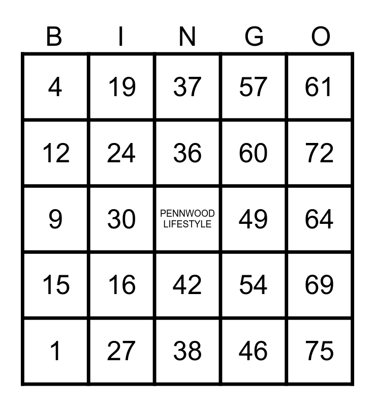 This bingo card has a free space and 24 words: 1, 16, 36, 46, 61, 4, 19, 37, 49, 64, 9, 24, 54, 69, 12, 27, 38, 57, 72, 15, 30, 42, 60 and 75.