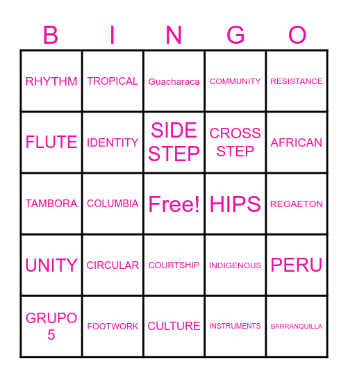 This bingo card has a free space and 29 words: GRUPO 5, CUMBIA, COLUMBIA, COLONIAL, RHYTHM, Guacharaca, IDENTITY, CIRCULAR, HIPS, FOOTWORK, REGAETON, BARRANQUILLA, CULTURE, INSTRUMENTS, AFRICAN, CARNIVAL, COURTSHIP, UNITY, RESISTANCE, TAMBORA, INDIGENOUS, SALSA, CROSS STEP, FLUTE, COMMUNITY, TROPICAL, PERU, SIDE STEP and Afro-Colombian.