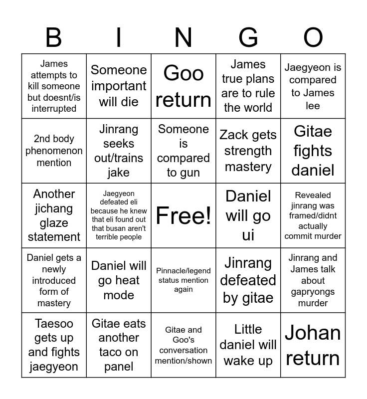This bingo card has a free space and 24 words: Daniel will go heat mode, Gitae eats another taco on panel, Someone is compared to gun, Taesoo gets up and fights jaegyeon, Jaegyeon is compared to James lee, James attempts to kill someone but doesnt/is interrupted, 2nd body phenomenon mention, Someone important will die, Daniel will go ui, Pinnacle/legend status mention again, Zack gets strength mastery, Another jichang glaze statement, Jinrang defeated by gitae, Jinrang and James talk about gapryongs murder, Jinrang seeks out/trains jake, Little daniel will wake up, Revealed jinrang was framed/didnt actually commit murder, Goo return, Gitae fights daniel, Jaegyeon defeated eli because he knew that eli found out that busan aren't terrible people, Johan return, Daniel gets a newly introduced form of mastery, James true plans are to rule the world and Gitae and Goo's conversation mention/shown.