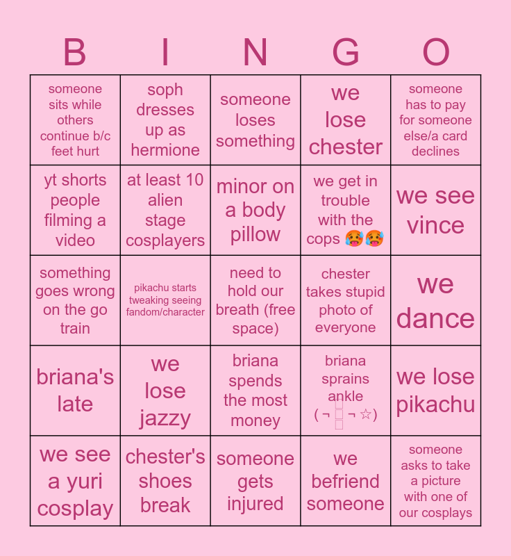 This bingo card has a free space and 41 words: briana buys something first, something goes wrong on the go train, we lose aria, at least 10 alien stage cosplayers, chester's shoes break, briana spends the most money, minor on a body pillow, we lose lucy, someone has to pay for someone else/a card declines, briana's late, pikachu starts tweaking seeing fandom/character, we lose chester, someone asks to take a picture with one of our cosplays, we dance, chester takes stupid photo of everyone, we lose jazzy, we lose sophia, someone sits while others continue b/c feet hurt, we run into someone we r awkward with, someone loses something, we lose pikachu, we lose briana, someone gets injured, we get in trouble with the cops 🥵🥵, someone buys NOTHING, we get scammed, we befriend someone, someone slips, we see vince, we see caitvi, we see severance, soph dresses up as hermione, we see a yuri cosplay, we take photos with cat maid people, briana sprains ankle (¬︿̫̿¬☆), yt shorts people filming a video, we see/meet vtubers, we get caught in a vlog, we get free stuff, we get matching stuff and we get interviewed.