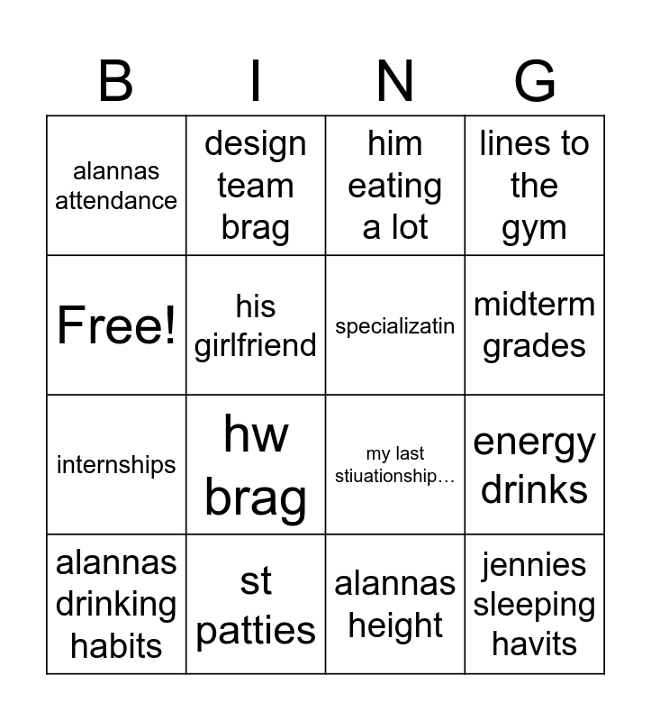 This bingo card has 16 words: st patties, energy drinks, him eating a lot, alannas attendance, internships, design team brag, my last stiuationship…, alannas height, Free!, his girlfriend, alannas drinking habits, lines to the gym, hw brag, midterm grades, specializatin and jennies sleeping havits.
