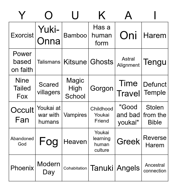 This bingo card has 72 words: Genderswap, Yuki-Onna, Tengu, Angels, Demons, Secret Society, Has a human form, Dragons, Kitsune, Zodiac-based, Vampires, Werewolves, Ghosts, Exorcist, Jorougumo, Astral Alignment, Occult Fan, Oni, Momotarou, Magic High School, Time Travel, Nine Tailed Fox, Youkai at war with humans, Youkai learning human culture, Phoenix, Snake Person, Orochi, Feudal Japan, Modern Day, Foreigner, Childhood Youkai Friend, Forgotten Promise, Miko, Contract, Stolen from the Bible, Tanuki, Kappa, Romance, Harem, Reverse Harem, Defunct Temple, Abandoned God, Battle Shounen, Hitotsume-kozou, Wisps, Gorgon, Greek, Magic seeing eye, In denial, Cohabitation, Ancestral connection, Monks, Demon Slayer, Scared villagers, Fog, Spooky Forest, Bamboo, Talismans, Stick with papers, Shimenawa, Significant Animal, Underworld, Heaven, "Good and bad youkai", Cursed sword, Weapon spirit, Power based on faith, Humans forgot youkai, Invisible to normies, Fake news, Government involvement and Portal/Gate.