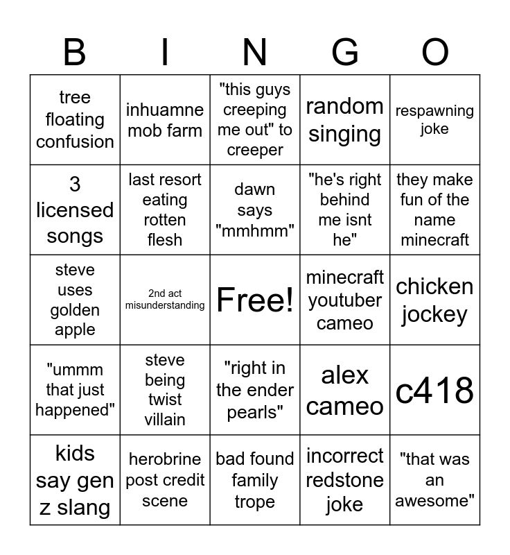 This bingo card has a free space and 24 words: steve being twist villain, herobrine post credit scene, dawn says "mmhmm", kids say gen z slang, respawning joke, tree floating confusion, 3 licensed songs, inhuamne mob farm, minecraft youtuber cameo, "right in the ender pearls", "he's right behind me isnt he", steve uses golden apple, alex cameo, c418, last resort eating rotten flesh, incorrect redstone joke, chicken jockey, "this guys creeping me out" to creeper, they make fun of the name minecraft, 2nd act misunderstanding, "that was an awesome", "ummm that just happened", random singing and bad found family trope.