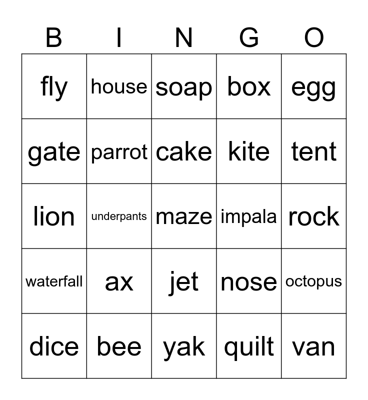 This bingo card has a free space and 24 words: ax, bee, cake, dice, egg, fly, gate, house, impala, jet, kite, lion, nose, octopus, parrot, quilt, rock, soap, tent, underpants, van, waterfall, box and yak.