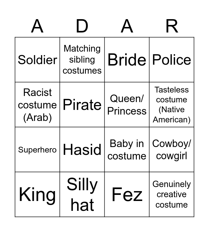 This bingo card has 16 words: Silly hat, Cowboy/ cowgirl, Bride, Soldier, Superhero, Matching sibling costumes, Baby in costume, Fez, Racist costume (Arab), Pirate, King, Police, Hasid, Tasteless costume (Native American), Queen/ Princess and Genuinely creative costume.