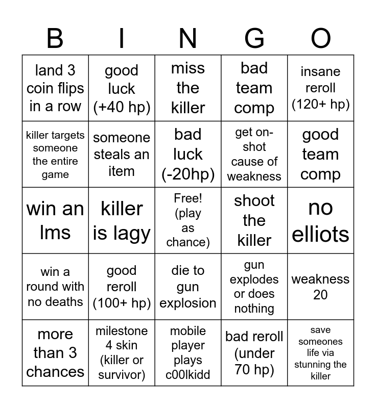 This bingo card has a free space and 24 words: more than 3 chances, good reroll (100+ hp), bad luck (-20hp), bad reroll (under 70 hp), insane reroll (120+ hp), land 3 coin flips in a row, good luck (+40 hp), miss the killer, shoot the killer, no elliots, win an lms, someone steals an item, gun explodes or does nothing, weakness 20, killer targets someone the entire game, milestone 4 skin (killer or survivor), mobile player plays c00lkidd, bad team comp, good team comp, win a round with no deaths, killer is lagy, die to gun explosion, get on-shot cause of weakness and save someones life via stunning the killer.