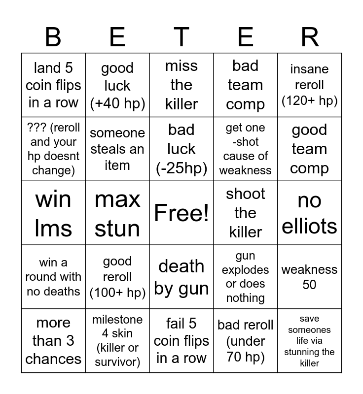 This bingo card has a free space and 24 words: more than 3 chances, good reroll (100+ hp), bad luck (-25hp), bad reroll (under 70 hp), insane reroll (120+ hp), land 5 coin flips in a row, good luck (+40 hp), miss the killer, shoot the killer, no elliots, win lms, someone steals an item, gun explodes or does nothing, weakness 50, ??? (reroll and your hp doesnt change), milestone 4 skin (killer or survivor), fail 5 coin flips in a row, bad team comp, good team comp, win a round with no deaths, max stun, death by gun, get one -shot cause of weakness and save someones life via stunning the killer.