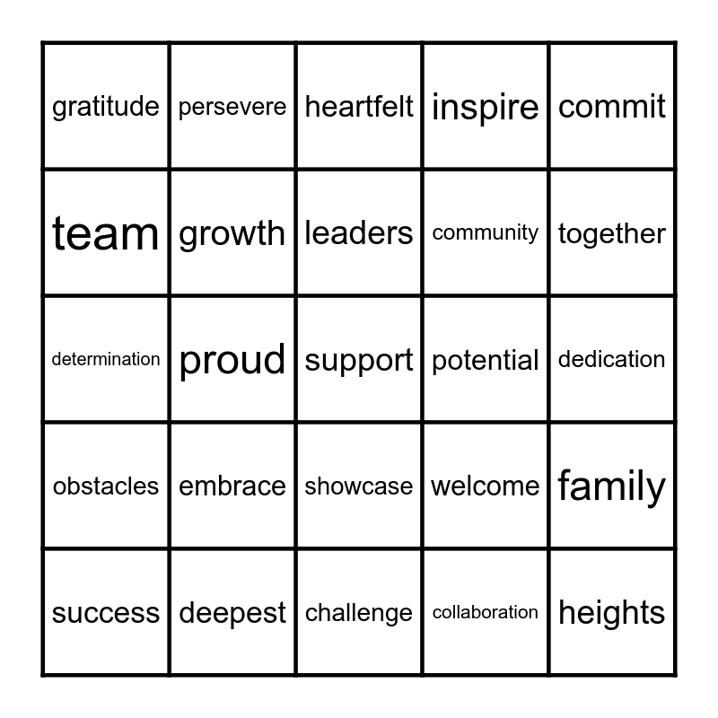 This bingo card has 25 words: embrace, challenge, leaders, success, commit, gratitude, team, persevere, potential, showcase, community, determination, welcome, family, growth, heights, dedication, heartfelt, together, proud, support, deepest, obstacles, inspire and collaboration.