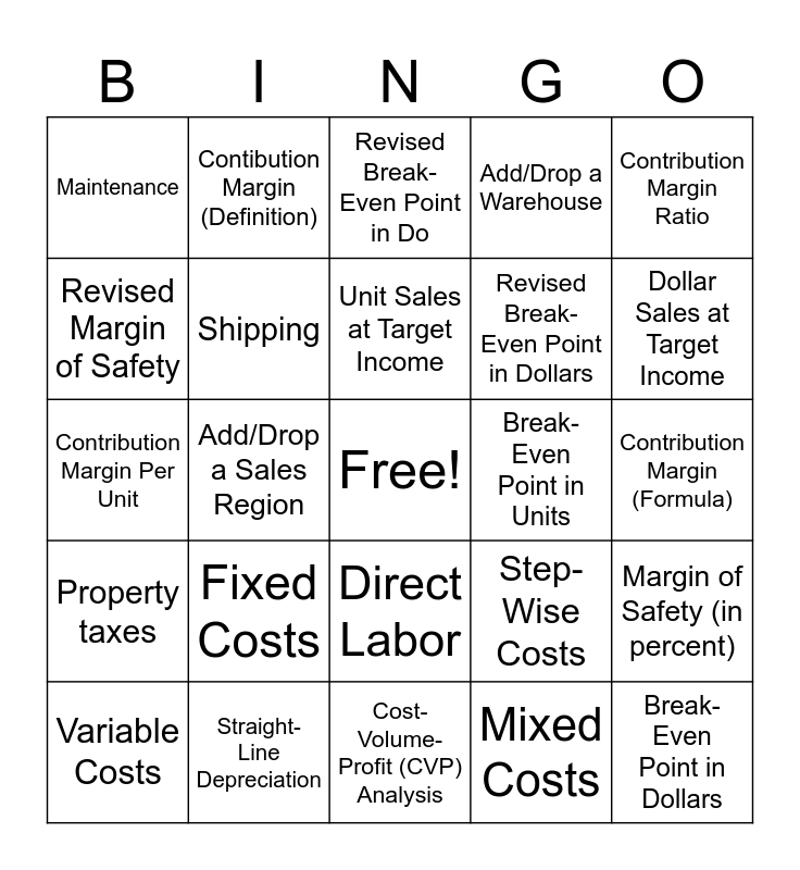 This bingo card has a free space and 24 words: Fixed Costs, Straight-Line Depreciation, Unit Sales at Target Income, Variable Costs, Contribution Margin Ratio, Maintenance, Revised Margin of Safety, Contibution Margin (Definition), Break-Even Point in Units, Direct Labor, Revised Break-Even Point in Dollars, Contribution Margin Per Unit, Step-Wise Costs, Margin of Safety (in percent), Shipping, Mixed Costs, Contribution Margin (Formula), Revised Break-Even Point in Do, Dollar Sales at Target Income, Add/Drop a Sales Region, Break-Even Point in Dollars, Property taxes, Add/Drop a Warehouse and Cost-Volume-Profit (CVP) Analysis.