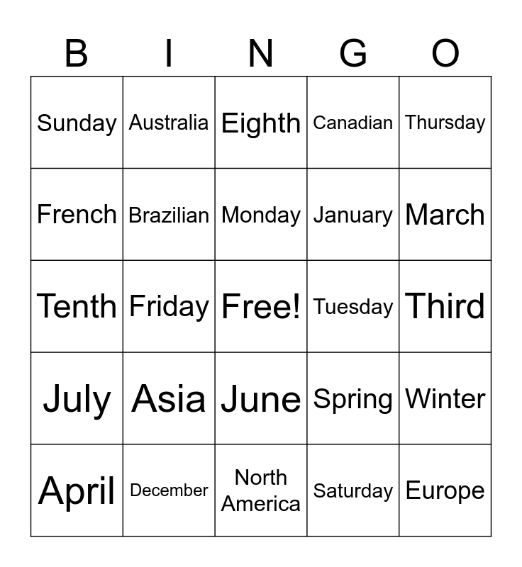 This bingo card has a free space and 48 words: Antarctica, Europe, South America, North America, Asia, Africa, Australia, Spanish, French, Portuguese, Brazilian, Canadian, Winter, Spring, Summer, Autumn, Monday, Tuesday, Wednesday, Thursday, Friday, Saturday, Sunday, January, February, March, April, May, June, July, August, September, October, November, December, First, Second, Third, Fourth, Fifth, Sixth, Seventh, Eighth, Ninth, Tenth, Twenty first, Twenty second and Twenty third.