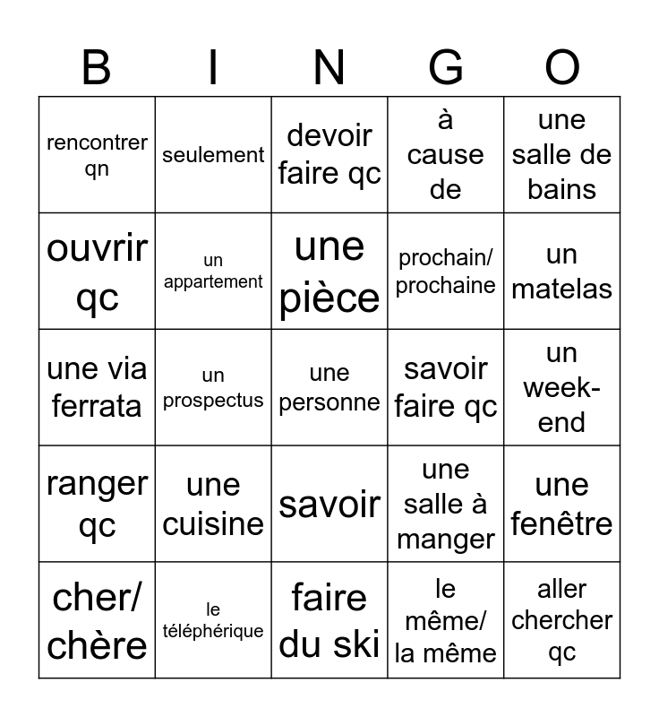 This bingo card has 30 words: le téléphérique, une lettre, un prospectus, découvrir qc, rencontrer qn, devoir faire qc, un appartement, savoir, savoir faire qc, faire du ski, un week-end, une personne, le même/ la même, aller chercher qc, un matelas, une chaise, une salle à manger, ranger qc, une cuisine, une salle de bains, une via ferrata, ensuite, seulement, prochain/ prochaine, ouvrir qc, à cause de, une fenêtre, cher/ chère, une pièce and c'est pourquoi.