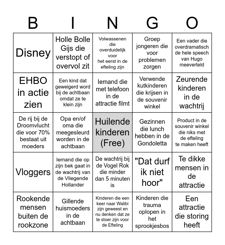 This bingo card has a free space and 30 words: Gillende huismoeders in de achtbaan, School/klassen uitje, Opa en/of oma die meegesleurd worden in de achtbaan, "ik let wel op de tassen", Disney, Volwassenen die overduidelijk voor het eerst in de efteling zijn, Een kind dat geweigerd word bij de achtbaan omdat ze te klein zijn, De wachtrij bij de Vogel Rok die minder dan 5 minuten is, Gezinnen die lunch hebben in de Gondoletta, Kinderen die een keer naar Walibi zijn geweest en nu denken dat ze te stoer zijn voor de Efteling, Product in de souvenir winkel die niks met de efteling te maken heeft, Een attractie die storing heeft, Kinderen die trauma oplopen in het sprookjesbos, Kinderwagen parkeerplaats bij de Carnaval Festival die overvol is, Zeurende kinderen in de wachtrij, "... Anders gaan we naar huis hoor", "Dat durf ik niet hoor", Vloggers, Iemand die op zijn bek gaat in de wachtrij van de Vliegende Hollander, Een vader die overdramatisch de hele speech van Hugo meeverteld, De rij bij de Droomvlucht die voor 70% bestaat uit moeders, Kleine kinderen die bang zijn van pardoes, Holle Bolle Gijs die verstopt of overvol zit, Verwende kutkinderen die krijsen in de souvenir winkel, EHBO in actie zien, Groep jongeren die voor problemen zorgen, Te dikke mensen in de attractie, Rookende mensen buiten de rookzone, Iemand die met telefoon in de attractie filmt and Stil staan in de carnaval festival.