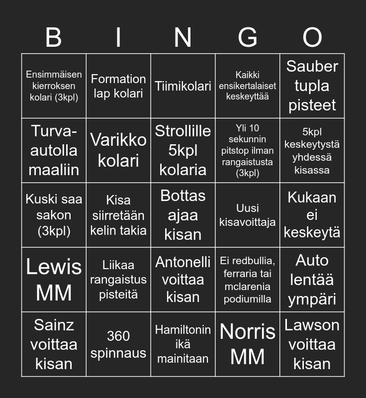 This bingo card has 25 words: Lewis MM, 360 spinnaus, Bottas ajaa kisan, Norris MM, Sauber tupla pisteet, Ensimmäisen kierroksen kolari (3kpl), Formation lap kolari, Tiimikolari, Uusi kisavoittaja, Auto lentää ympäri, Turva-autolla maaliin, Varikko kolari, Hamiltonin ikä mainitaan, Ei redbullia, ferraria tai mclarenia podiumilla, 5kpl keskeytystä yhdessä kisassa, Sainz voittaa kisan, Kisa siirretään kelin takia, Strollille 5kpl kolaria, Yli 10 sekunnin pitstop ilman rangaistusta (3kpl), Kukaan ei keskeytä, Kuski saa sakon (3kpl), Liikaa rangaistus pisteitä, Antonelli voittaa kisan, Kaikki ensikertalaiset keskeyttää and Lawson voittaa kisan.