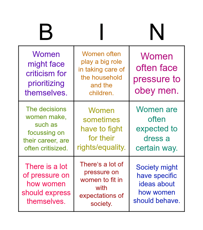 This bingo card has 9 words: There is a lot of pressure on how women should express themselves., Women often face pressure to obey men., Women often play a big role in taking care of the household and the children., The decisions women make, such as focussing on their career, are often critisized., Women might face criticism for prioritizing themselves., Women are often expected to dress a certain way., Women sometimes have to fight for their rights/equality., Society might have specific ideas about how women should behave. and There‘s a lot of pressure on women to fit in with expectations of society..