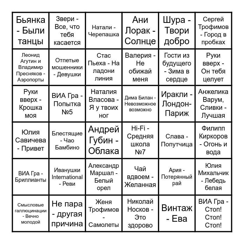 This bingo card has 60 words: Андрей Губин - Девушки как звезды, Hi-Fi - Средняя школа №7, Пропаганда - Яй-я, Дима Билан - Невозможное возможно, Филипп Киркоров - Огонь и вода, Филипп Киркоров - Просто подари, Леонид Агутин и Владимир Пресняков - Аэропорты, Чичерина - Ту-лу-ла, Стас Пьеха - На ладони линия, Кристина Орбакайте - Перелетная птица, Ани Лорак - Солнце, Елена Ваенга - Курю, Сергей Трофимов - Город в пробках, Смысловые галлюцинации - Вечно молодой, Максим - Знаешь ли ты, Бьянка - Были танцы, Руки вверх - Крошка моя, Шура - Твори добро, Паскаль - Шёлковое сердце, Отпетые мошенники - Девушки, ВИА Гра - Попытка №5, Натали - Черепашка, Андрей Губин - Облака, Блестящие - Чао Бамбино, Баста - Моя игра, Не пара - другая причина, Ария - Потерянный рай, Тимати feat Dj Dlee - В клубе, Валерия - Не обижай меня, Николай Носков - Это здорово, Танцы минус - Цветы, Децл - Вечеринка, Блестящие - А я всё летала, Игорь Корнелюк - Город, которого нет, Звери - Все, что тебя касается, Иванушки International - Реви, Звери - До скоро встречи, Руки вверх - Он тебя целует, Женя Трофимов - Самолеты, Гости из будущего - Зима в сердце, Валерий Меладзе - Текила-Любовь, Иракли - Лондон-Париж, Наталия Власова - Я у твоих ног, Валерий Меладзе - Салют, Вера!, Юлия Савичева - Привет, Чай вдвоем - Желанная, Uma2rman - Проститься, Валерий Меладзе - Красиво, Чи-ли - Сердце, Анжелика Варум, Сливки - Лучшая, Слава - Попутчица, Женя Трофимов - Поезда, ВИА Гра - Стоп! Стоп! Стоп!, Александр Маршал - Белый орел, Юлия Михальчик - Лебедь белая, Винтаж - Ева, Катя Лель - Мой мармеладный, Надежда Кадышева - Плывет веночек, ВИА Гра - Бриллианты and REFLEX - Non Stop.
