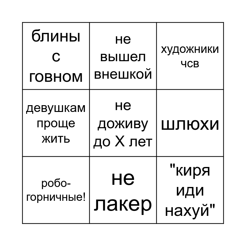 This bingo card has a free space and 8 words: шлюхи, художники чсв, не вышел внешкой, робо-горничные!, блины с говном, "киря иди нахуй", девушкам проще жить and не лакер.