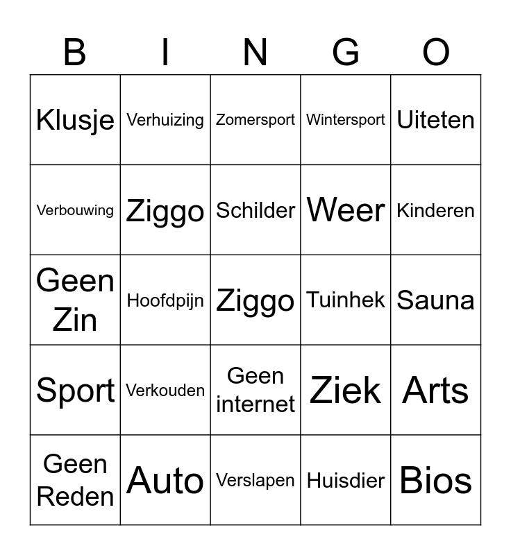 This bingo card has a free space and 24 words: Verkouden, Auto, Schilder, Geen Reden, Uiteten, Klusje, Verbouwing, Verhuizing, Tuinhek, Geen internet, Weer, Geen Zin, Ziek, Arts, Ziggo, Huisdier, Sauna, Zomersport, Kinderen, Hoofdpijn, Bios, Sport, Wintersport and Verslapen.
