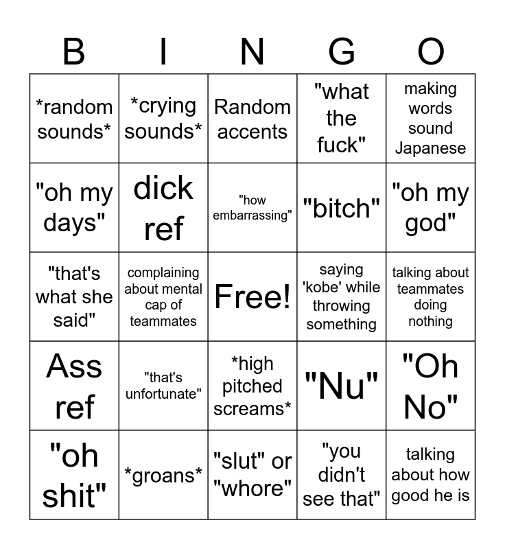 This bingo card has a free space and 24 words: "that's unfortunate", *groans*, "how embarrassing", "oh shit", making words sound Japanese, *random sounds*, "oh my days", *crying sounds*, saying 'kobe' while throwing something, *high pitched screams*, "bitch", "that's what she said", "Nu", "Oh No", dick ref, "you didn't see that", talking about teammates doing nothing, Random accents, "oh my god", complaining about mental cap of teammates, talking about how good he is, Ass ref, "what the fuck" and "slut" or "whore".