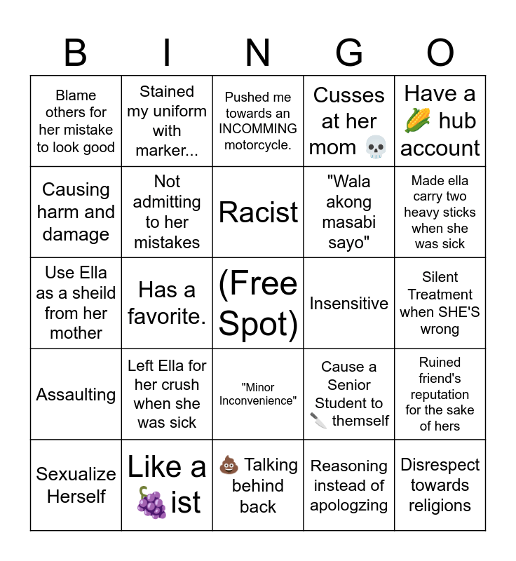This bingo card has a free space and 24 words: Left Ella for her crush when she was sick, Like a πist, Racist, Sexualize Herself, Have a π½ hub account, Blame others for her mistake to look good, Causing harm and damage, Stained my uniform with marker..., Insensitive, "Minor Inconvenience", "Wala akong masabi sayo", Use Ella as a sheild from her mother, Cause a Senior Student to πͺ themself, Ruined friend's reputation for the sake of hers, Not admitting to her mistakes, Reasoning instead of apologzing, Silent Treatment when SHE'S wrong, Pushed me towards an INCOMMING motorcycle., Made ella carry two heavy sticks when she was sick, Has a favorite., Disrespect towards religions, Assaulting, Cusses at her mom π and π© Talking behind back.