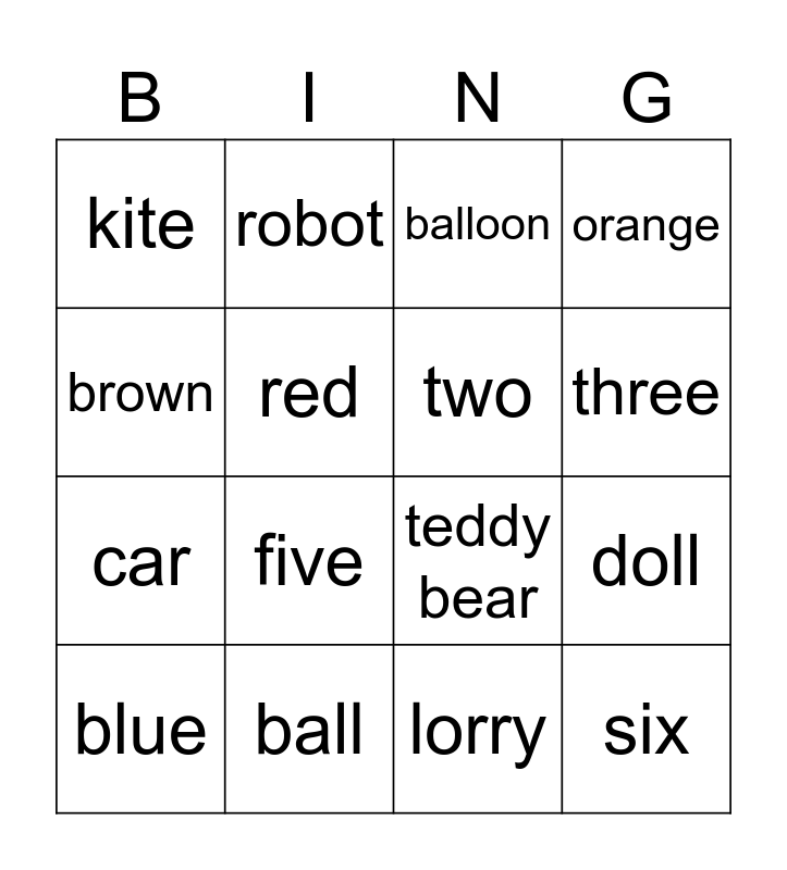 This bingo card has 16 words: ball, doll, balloon, kite, car, robot, teddy bear, lorry, brown, red, blue, orange, five, three, two and six.
