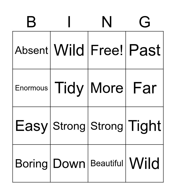 This bingo card has 18 words: Strong, Wild, Free!, Absent, Strong, Past, Boring, Wild, Far, Easy, Beautiful, Enormous, Tight, Tidy, More, In, Down and Hot.