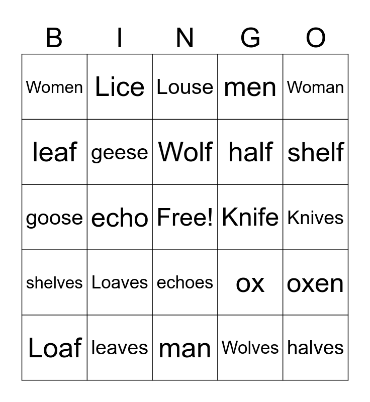 This bingo card has a free space and 24 words: Loaf, Loaves, Wolf, Wolves, Woman, Women, Lice, Louse, Knife, Knives, goose, geese, ox, oxen, leaf, leaves, man, men, shelf, shelves, echo, echoes, half and halves.