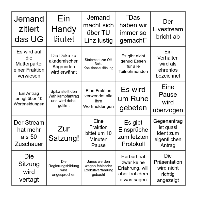 This bingo card has 25 words: Zur Satzung!, Junos werden wegen fehlender Exekutiverfahrung gebasht, Statement zur ÖH Boku Koalitionsauflösung, Die Sitzung wird vertagt, Der Livestream bricht ab, Jemand zitiert das UG, Es wird auf die Mutterpartei einer Fraktion verwiesen, Ein Handy läutet, Es wird um Ruhe gebeten, Eine Fraktion bittet um 10 Minuten Pause, Es gibt nicht genug Essen für alle Teilnehmenden, Ein Antrag bringt über 10 Wortmeldungen, Es gibt Einsprüche zum letzten Protokoll, Gegenantrag ist quasi ident zum eigentlichen Antrag, Die Doku zu akademischen Abgründen wird erwähnt, Die Präsentation wird nicht richtig angezeigt, Eine Pause wird überzogen, Jemand macht sich über TU Linz lustig, Ein Verhalten wird als ehrenlos bezeichnet, Spika stellt den Wahlkampfantrag und wird dabei gefilmt, Eine Fraktion verwendet alle ihre Wortmeldungen, Die Regierungsbildung wird angesprochen, Der Stream hat mehr als 50 Zuschauer, "Das haben wir immer so gemacht" and Herbert hat zwar keine Erfahrung, will aber trotzdem etwas sagen.