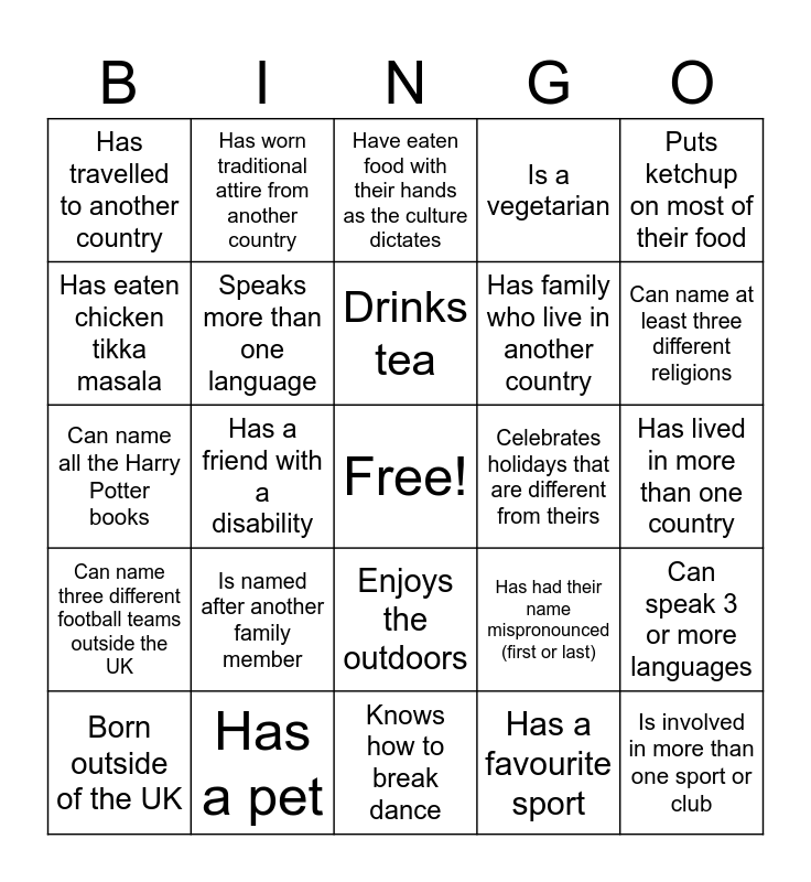 This bingo card has a free space and 29 words: Born outside of the UK, Has attended a religious ceremony in a church/temple/ mosque other than their own, Has a friend with a disability, Has an interracial family member, Has travelled to another country, Have eaten food with their hands as the culture dictates, Speaks more than one language, Is named after another family member, Celebrates holidays that are different from theirs, Has a pet, Has lived in more than one country, Is involved in more than one sport or club, Knows how to break dance, Has a favourite sport, Can name at least three different religions, Has had more than 2 siblings, Enjoys the outdoors, Can name three different football teams outside the UK, Puts ketchup on most of their food, Can name all the Harry Potter books, Has had their name mispronounced (first or last), Has tried food from at least three different countries, Has family who live in another country, Has eaten chicken tikka masala, Is a vegetarian, Has worn traditional attire from another country, Can speak 3 or more languages, Drinks tea and Rode on the bus to get to school as a child.
