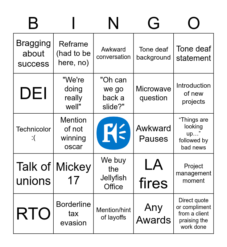 This bingo card has a free space and 58 words: Taxes/Rebates, Borderline tax evasion, Ironic statement, Talk of unions, Any Awards, Framestore Family!!!, "We're doing really well", Skipped QnA question, Microwave question, AI/ML mentioned, Tone deaf background, Mike Mcgee bullshit, Slideshow skill issue, Mic/Camera Issues, “Essential Travel”, Bragging about success, Direct quote or compliment from a client praising the work done, Tone deaf statement, Old person moment, "Oh can we go back a slide?", Awkward Pauses, Awkward conversation, RTO, Project management moment, Ego stroke, “Things are looking up…” followed by bad news, WIP showreel in beautiful 240p quality, Assurances of no more layoffs/office closures, Introduction of new projects, Something something IMMERSIVE!, “Essential spending”, Bad lighting, Really bad yapping, Tech news feed!, Reading off a script, Mention of William yapping on the BBC, Something along the lines of “Others may fall but Framestore will stand strong!”, Mention of not winning oscar, Technicolor :(, New UK tax breaks, Mickey 17, US election, LA fires, Method Acquisition, Jellyfish :(, Hiring from recently closed vfx houses :), Snow White, We buy the Jellyfish Office, Mention/hint of layoffs, Strengthen (our position with clients), Solid (financial foundation), Caution (around spend), Unnecessary (around spend/budgets), Unite (with regard to the Method artists in LA and special projects LA), Reframe (had to be here, no), “Turbulent/uncertain times”, DEI and #AD.