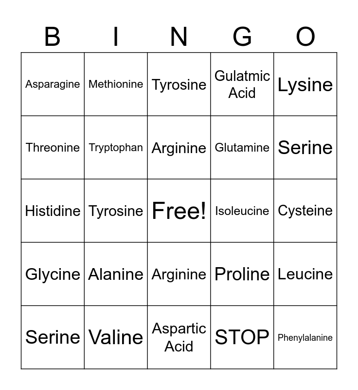This bingo card has a free space and 24 words: Alanine, Valine, Arginine, Serine, Lysine, Asparagine, Threonine, Methionine, Isoleucine, Arginine, Glutamine, Histidine, Proline, Leucine, Tryptophan, STOP, Cysteine, Tyrosine, Serine, Tyrosine, Phenylalanine, Glycine, Gulatmic Acid and Aspartic Acid.